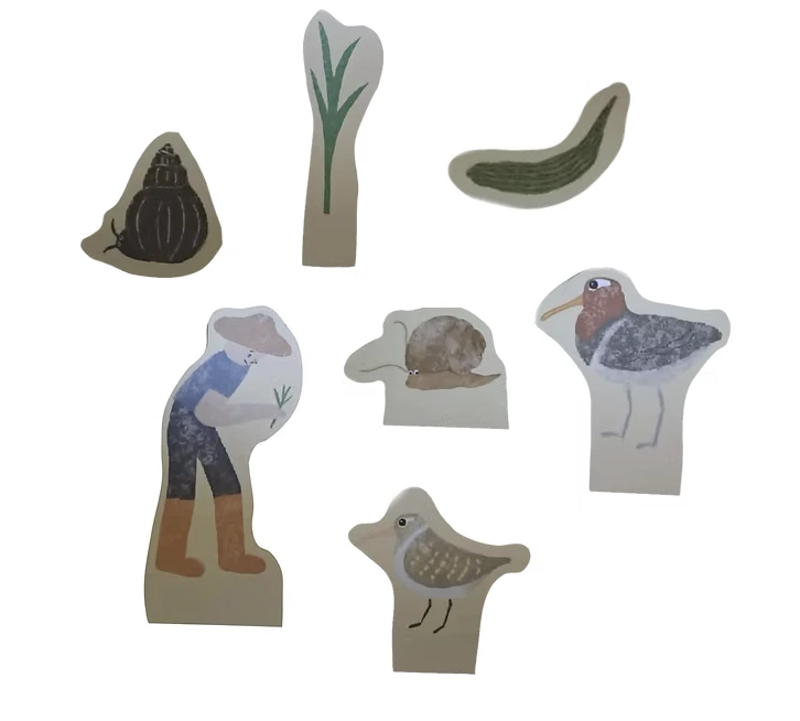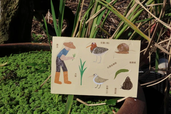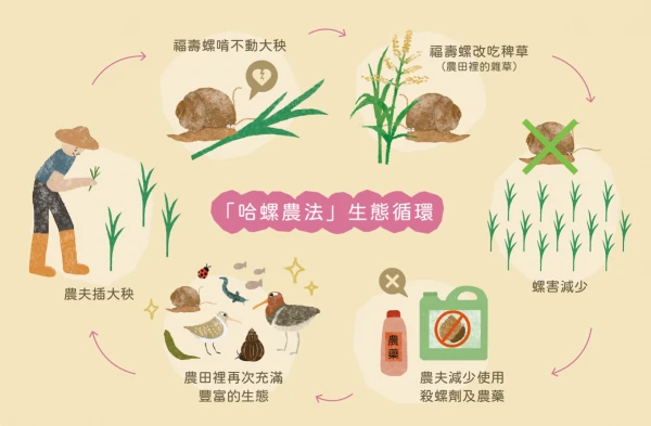 農夫揮汗耕作,福壽螺吃著秧苗,泥鰍與田螺悠遊水中,彩鷸在草叢間低吟。