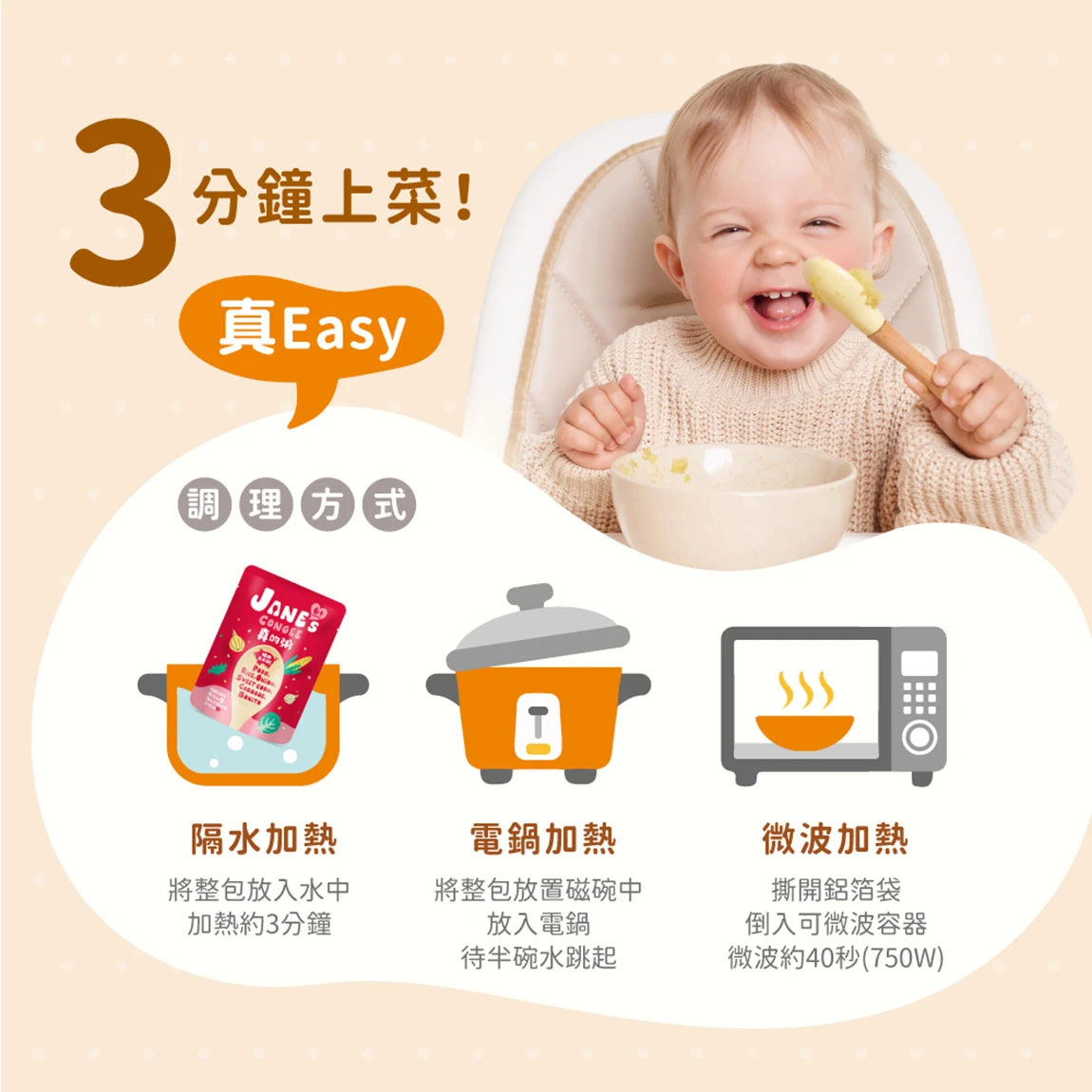 提供三種方式:隔水加熱(約3分鐘)、電鍋加熱,或倒入碗中微波(750W約40秒)。三種方式皆能維持風味,視您的方便性選擇即可。