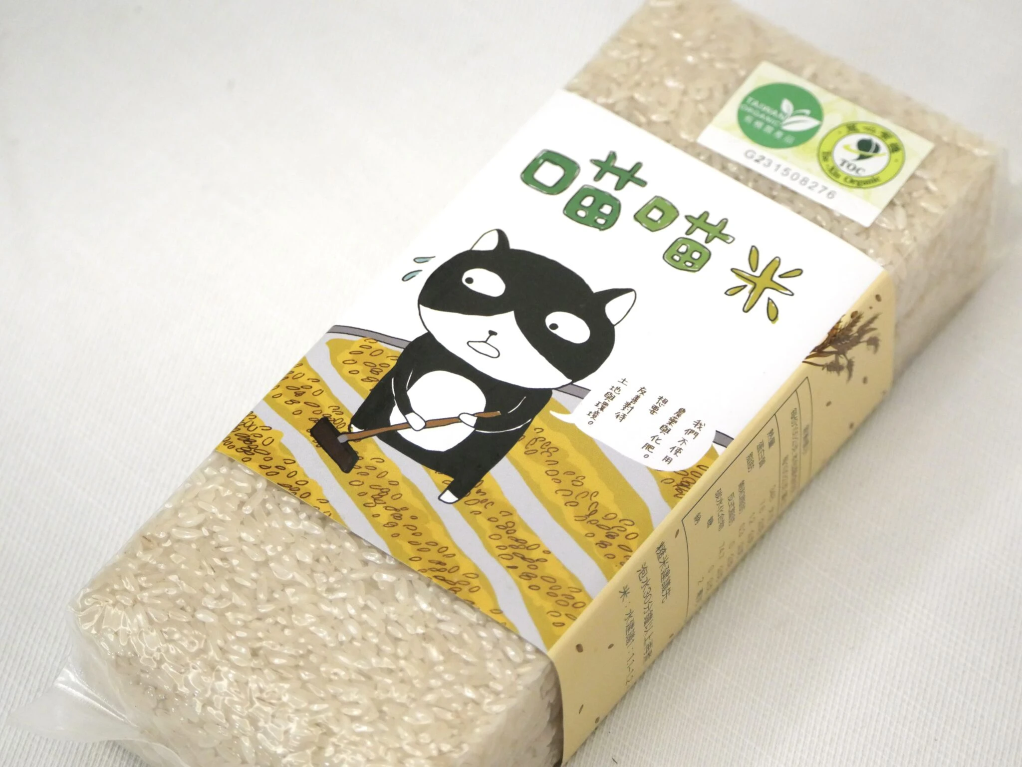 為了延續對愛貓喵喵的感情,他將品牌取名為「喵喵米」。這不只是愛貓的名字,「喵」字一邊是口、一邊像田上有草,象徵著對土地的供養與共生。如今,他更與「拼圖喵」合作,將資源循環落實於農耕之中。