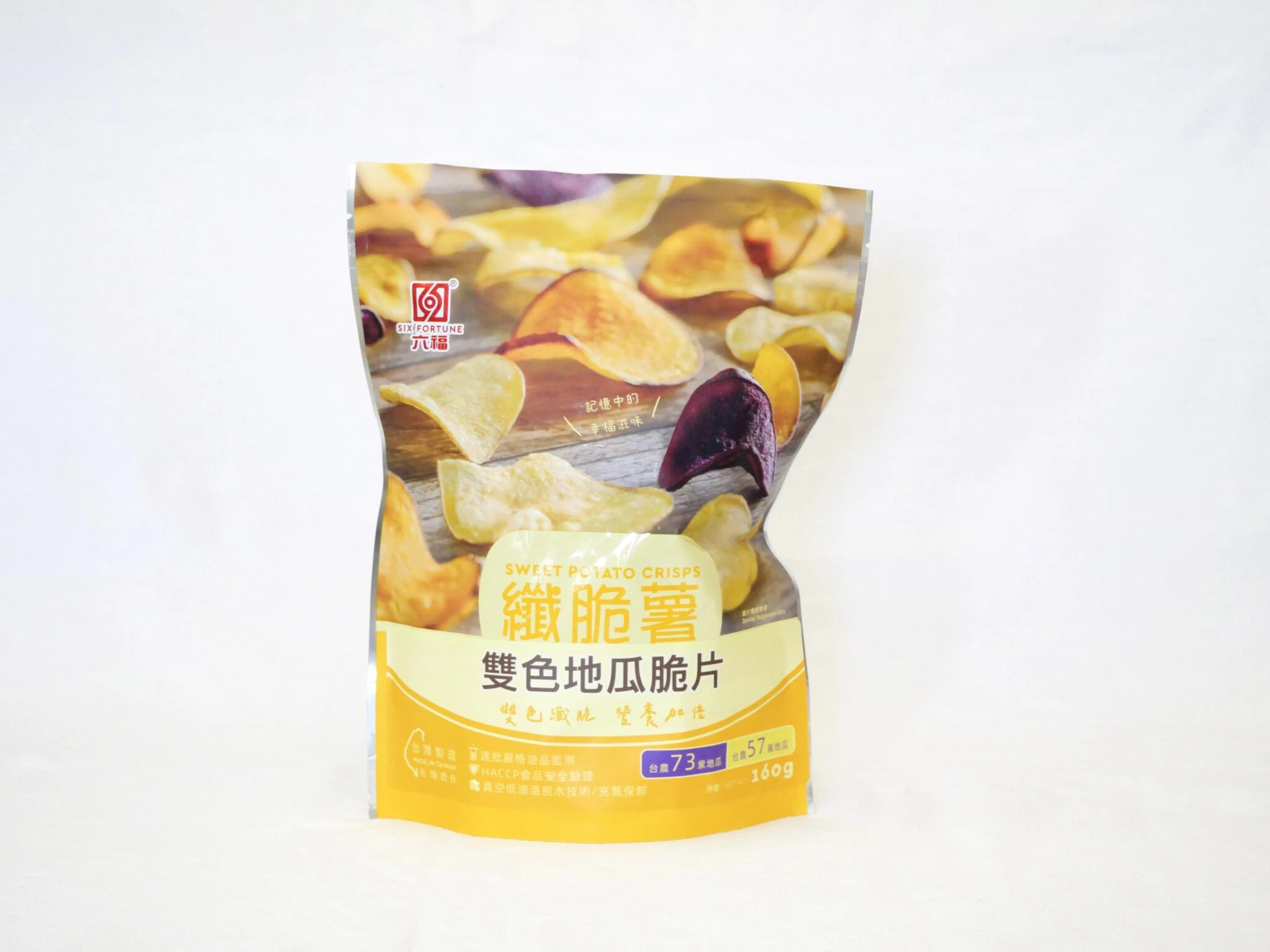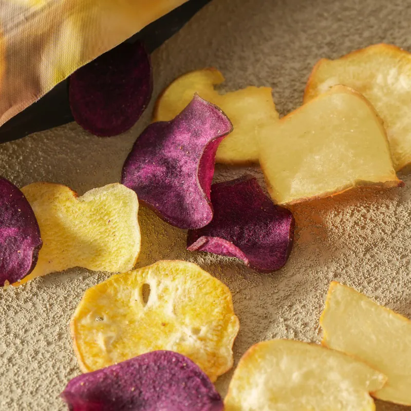 以台農57號黃地瓜與台農73號紫心地瓜製成。黃地瓜甜味明顯,紫地瓜則多一點紮實感與特有香氣。做成雙色版本時,吃起來不會只有單一風味,讓整包零食更有層次。