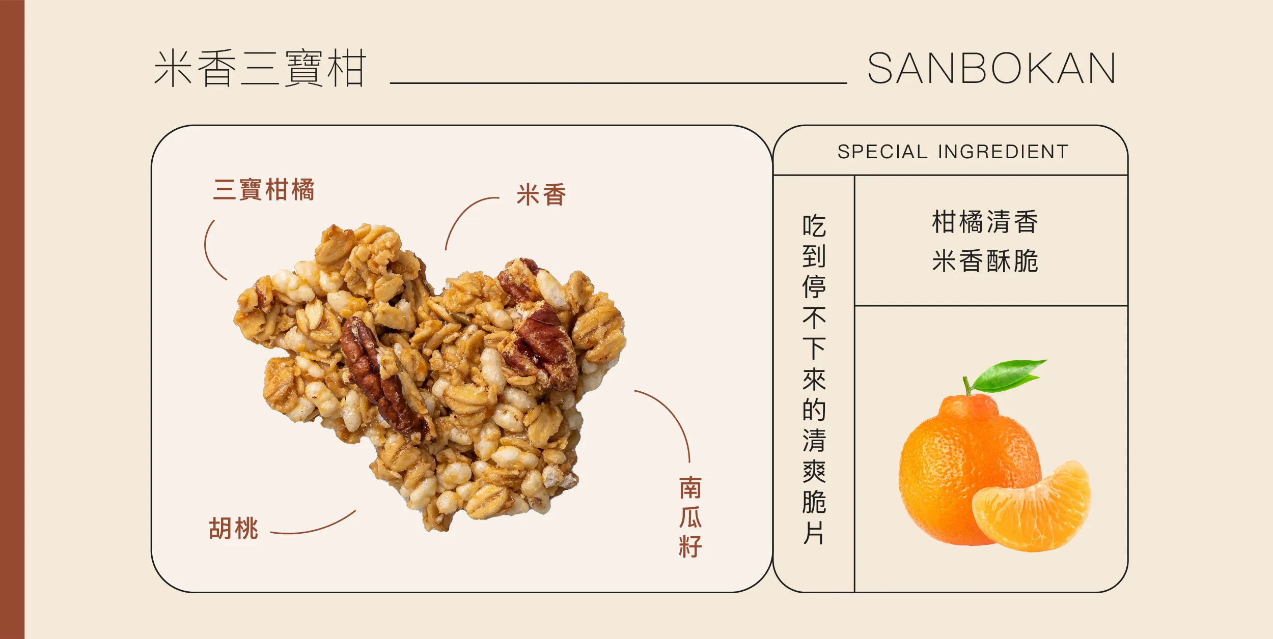 這是一款與新竹百年老店「隆源餅行」合作的清爽型燕麥脆片。選用新竹在地友善栽種的三寶柑,經手工古法蜜製與慢火熬煮,保留下柑橘明亮的香氣。入口感橘香清甜,搭配米香與胡桃的層次感,是一款風味乾淨、無負擔的日常點心。