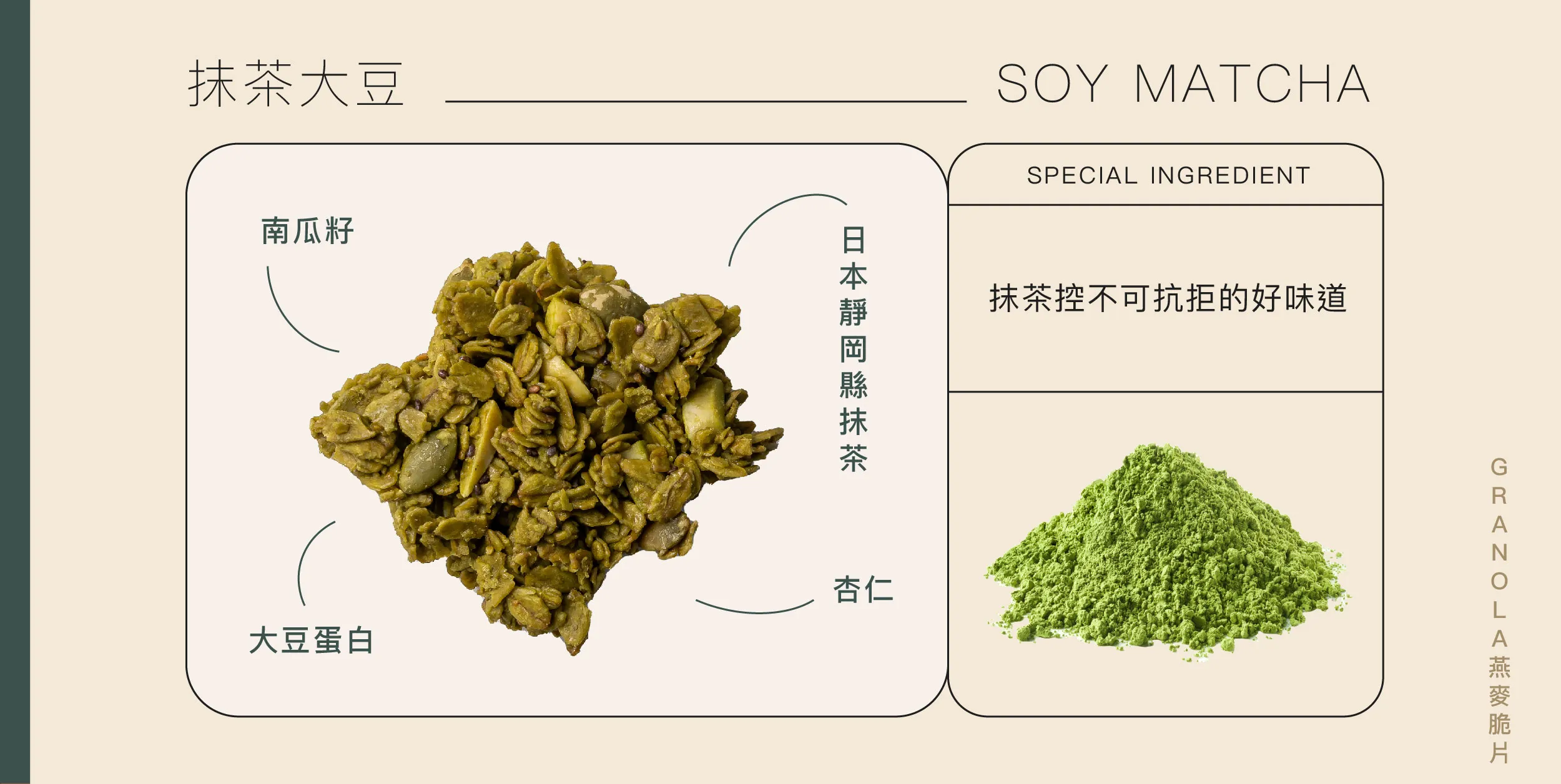 這是一款味道越嚼越明顯的燕麥脆片。不是一入口就很重的抹茶,而是先有淡淡茶香,接著在咀嚼中慢慢帶出抹茶的回甘。搭配特殊製成的全黃豆豆香,形成一種不苦、不澀、層次完整的純淨風味。
