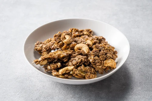 這款脆片由多種穀物與堅果組成:米香負責輕盈的清脆感,腰果帶來圓潤的堅果香氣,南瓜籽則提供了紮實的咀嚼層次。每一口都能吃到不同食材交織出的自然風味。